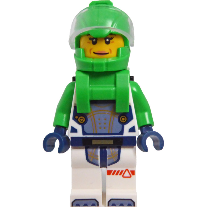 cty1753: Astronaut – Female, White Spacesuit with Bright Green Arms, Bright Green Helmet, Trans-Clear Visor, Bright Green Harness with Solar Panel, Closed Mouth