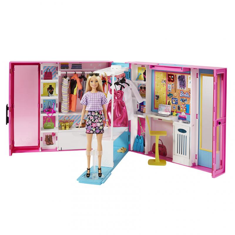 Dulapul de vis Barbie® este un vis devenit realitate pentru toți iubitorii de modă! Ești gata să dezvăluie ce ascunde garderoba? În dulap, există o zonă de joacă și mult spațiu de depozitare pentru o păpușă Barbie® și mai mult de 25 de lucruri, accesorii și haine. Desigur, există și dulapuri, rafturi și o tijă pentru dulap În dulap veți găsi, de asemenea, un spațiu de lucru cu computer și mult spațiu pentru a vă afișa modelele și prezentările de modă private. În garderobă veți găsi și patru ținute complete, inclusiv accesorii – haine la modă pentru o zi normală, halat de covor roșu, haine de lucru și haine de scufundare, inclusiv ochelari și aripioare. Odată ce a venit timpul să ne luăm la revedere de la jocuri, pur și simplu puneți totul înapoi în dulap. Luați-vă garderoba oriunde cu voi și bucurați-vă de o mulțime de distracție plină de modă!