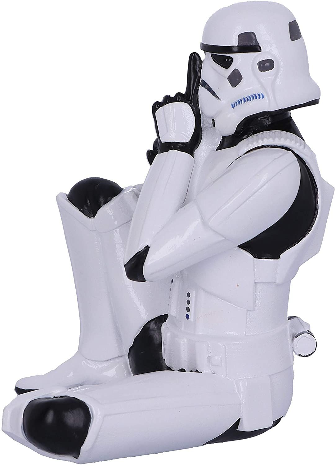 Această statuetă Nemesis Now îl prezintă pe un Stormtrooper într-o ipostază neobișnuită și plină de simbolism: cu degetul la gură, inspirat de celebra reprezentare „nu vorbi rău” din trio-ul celor trei maimuțe înțelepte. Designul face trimitere la sculpturile tradiționale din Nikko, Japonia, asociate templului Toshogu din secolul al XVII‑lea.
